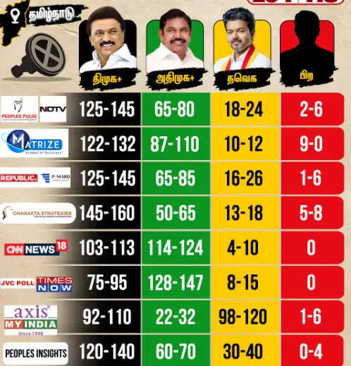இதில் தமிழகத்தைப் பொறுத்தவரை பல்வேறு நிறுவனங்களின் கணிப்பில் பெரும்பாலும் திமுக ஆட்சியைத் தொடரும் என்று தெரிவிக்கப்பட்டுள்ளது.
